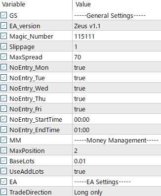 Backtest settings of Zeus XAUUSD M5 Long Only